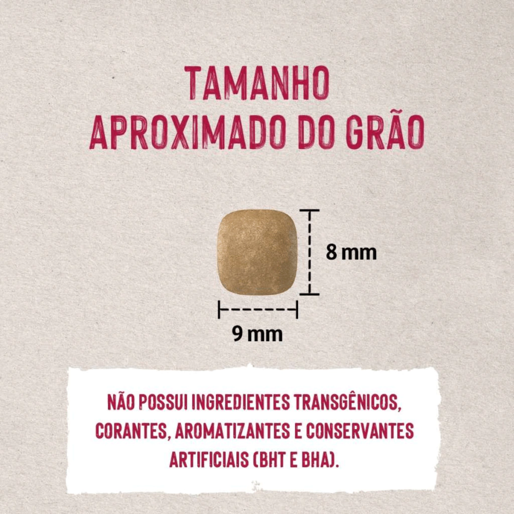 Farinha de vísceras de frango (mín. 28%), farinha de salmão (mín. 1%), farinha de torresmo, arroz quebrado (mín. 20%), sorgo integral moído, gordura de aves, gordura suína, complexo de vegetais (mín. 2,5%) (farinha de batata-doce, polpa desidratada de beterraba, brócolis desidratado, cenoura desidratada), grão de linhaça, levedura de cervejaria inativada desidratada, cloreto de potássio, parede celular de levedura (fonte de beta-glucano 1,3-1,6), hidrolisado de fígado de aves e suíno, mananoligossacarídeo (MOS) (mín. 0,1%), zeólita, lignocelulose, extrato de yucca (mín. 0,03%), extrato de alecrim (mín. 0,001%), tocoferol (concentrado mín. 0,09%), lisina, metionina, ácido fosfórico, taurina, acetato de retinol (vit. A), colecalciferol (vit. D3), ácido ascórbico (vit. C), acetato de DL-alfa-tocoferol (vit. E), mononitrato de tiamina (vit. B1), riboflavina (vit. B2), cloridrato de piridoxina (vit. B6), cianocobalamina (vit. B12), menadiona bissulfito de nicotinamida (vit. K3), biotina, cloreto de colina, niacina (vit. B3), ácido fólico (vit. B9), D-pantotenato de cálcio (vit. B5), sulfato de cobre monohidratado, sulfato de ferro, sulfato de zinco, sulfato de manganês, selenito de sódio, iodato de cálcio, minerais quelatados (proteinato de manganês, proteinato de selênio, proteinato de zinco).