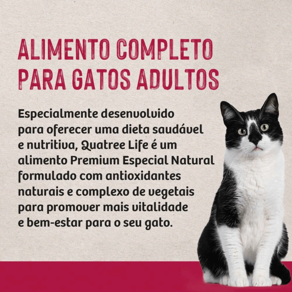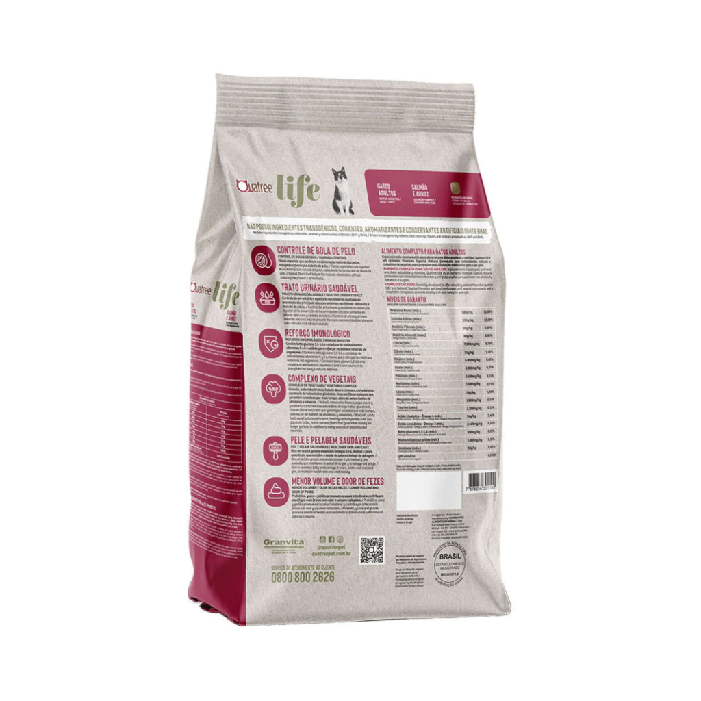 Especialmente desenvolvido para oferecer uma dieta saudável e nutritiva, Ração Seca Quatree Life Salmão e Arroz Gatos Adultos é um alimento Premium Especial Natural formulado com antioxidantes naturais e complexo de vegetais para promover mais vitalidade e bem-estar para o seu gato. Não possui ingredientes transgênicos, corantes, aromatizantes e conservantes artificiais (BHT e BHA).