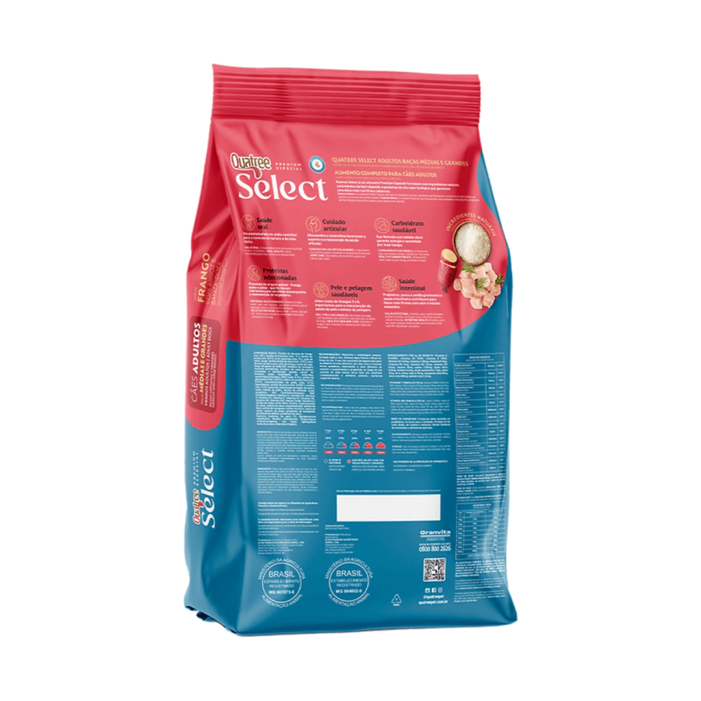 Quatree Select é um alimento Premium Especial desenvolvido para atender as necessidades nutricionais de cães adultos de raças médias e grandes. Com ingredientes naturais, proteínas de alto valor biológico e carboidratos de fácil digestão, proporciona uma alimentação equilibrada, nutritiva e saborosa para o seu pet.