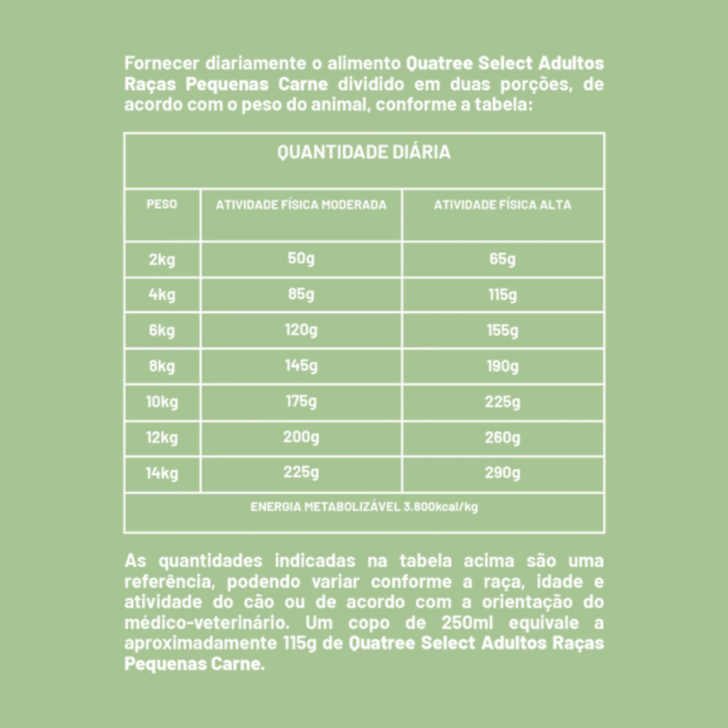 Quatree Select é um alimento Premium Especial desenvolvido para atender as necessidades nutricionais de cães adultos de raças pequenas. Com ingredientes naturais e altamente digestíveis, proporciona uma alimentação equilibrada, nutritiva e saborosa para o seu pet.