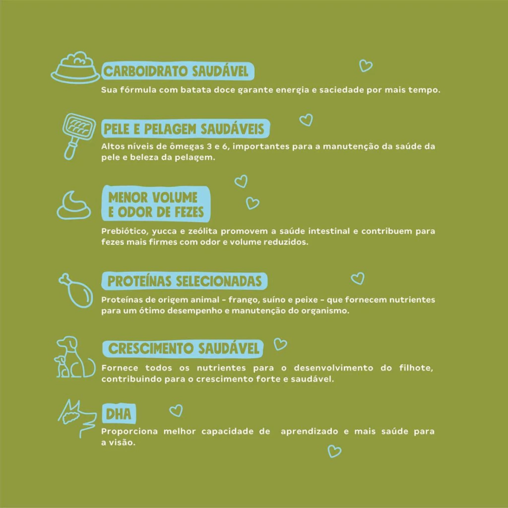 Proteínas Selecionadas: Contém proteínas de origem animal, como frango, suíno e peixe, que oferecem os nutrientes essenciais para o ótimo desempenho e manutenção do organismo do filhote.