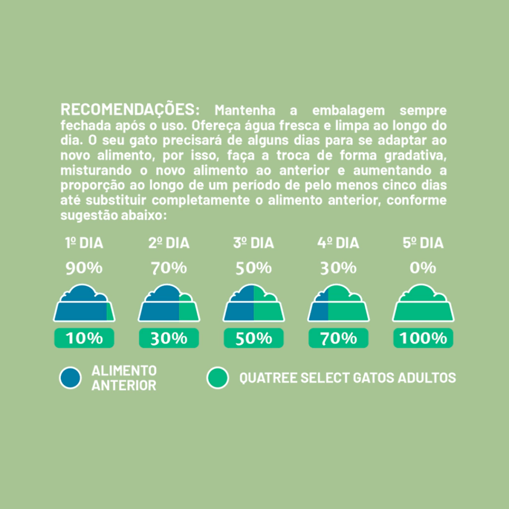 Quatree Select é um alimento Premium Especial formulado com ingredientes naturais, carboidratos de fácil digestão e proteínas de alto valor biológico que garantem uma dieta mais nutritiva e saborosa para o seu gato.