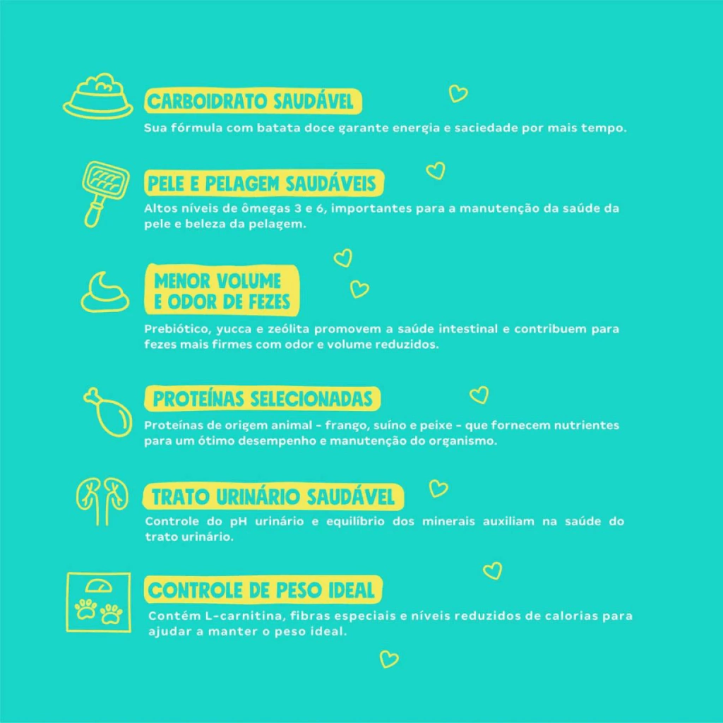 Pele e Pelagem Saudáveis: Altos níveis de ômegas 3 e 6, importantes para a manutenção da saúde da pele e beleza da pelagem.