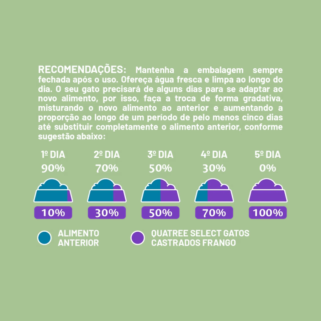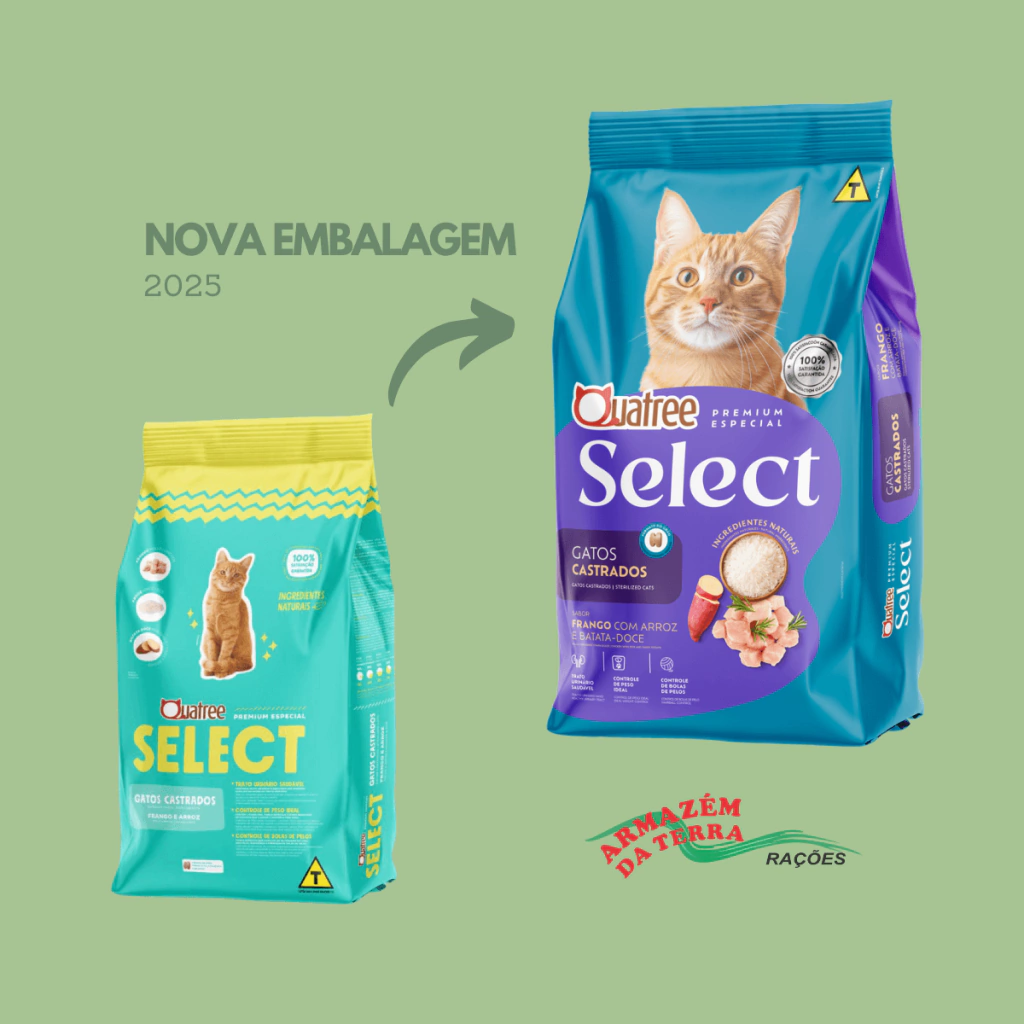 Quatree Select é um alimento Premium Especial formulado com ingredientes naturais, carboidratos de fácil digestão e proteínas de alto valor biológico que garantem uma dieta mais nutritiva e saborosa para o seu gato castrado.
