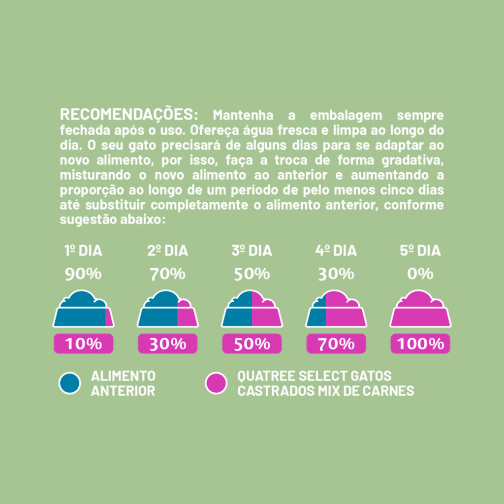 Quatree Select é um alimento Premium Especial desenvolvido para atender as necessidades nutricionais de gatos castrados. Sua fórmula balanceada auxilia na manutenção do peso ideal, promove a saúde do trato urinário e contribui para a eliminação natural dos pelos ingeridos. Com ingredientes naturais, proteínas de alto valor biológico e carboidratos de fácil digestão, proporciona uma alimentação completa, nutritiva e saborosa para o seu gato.