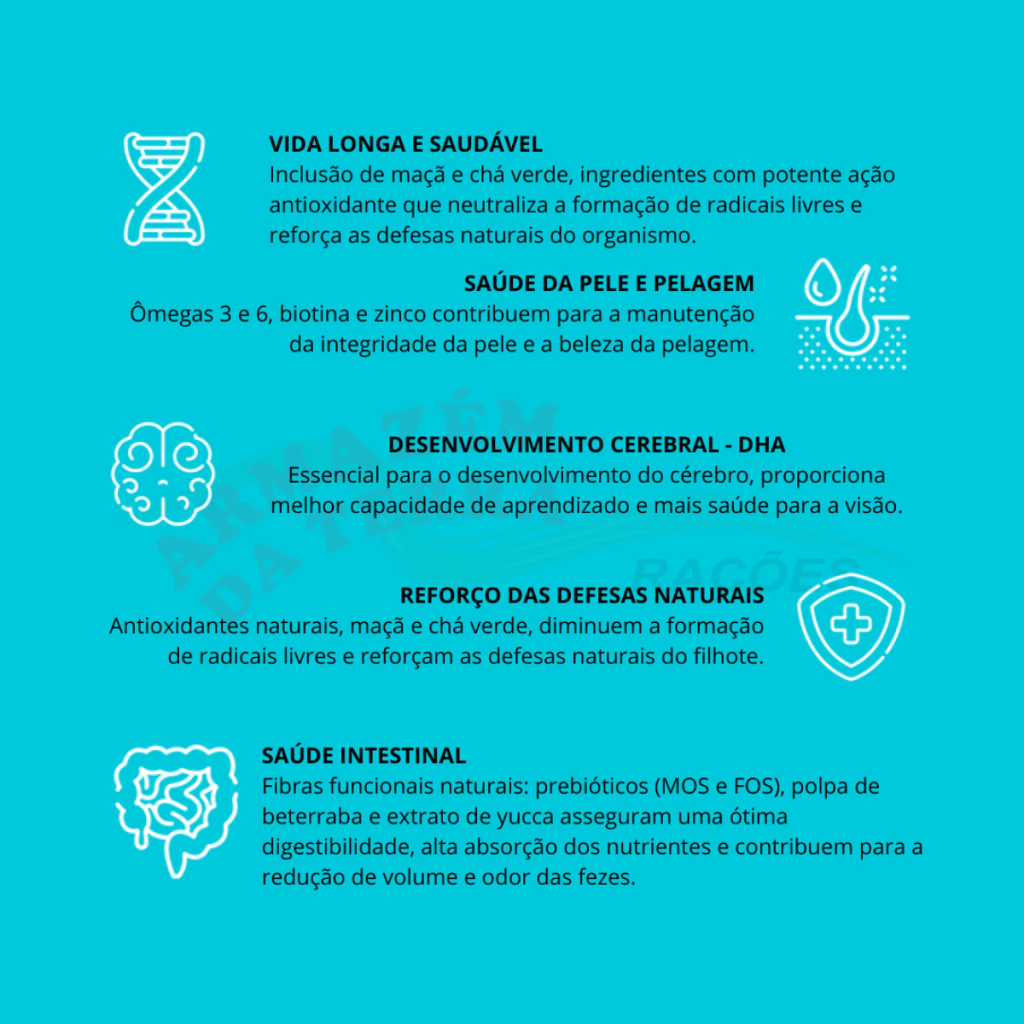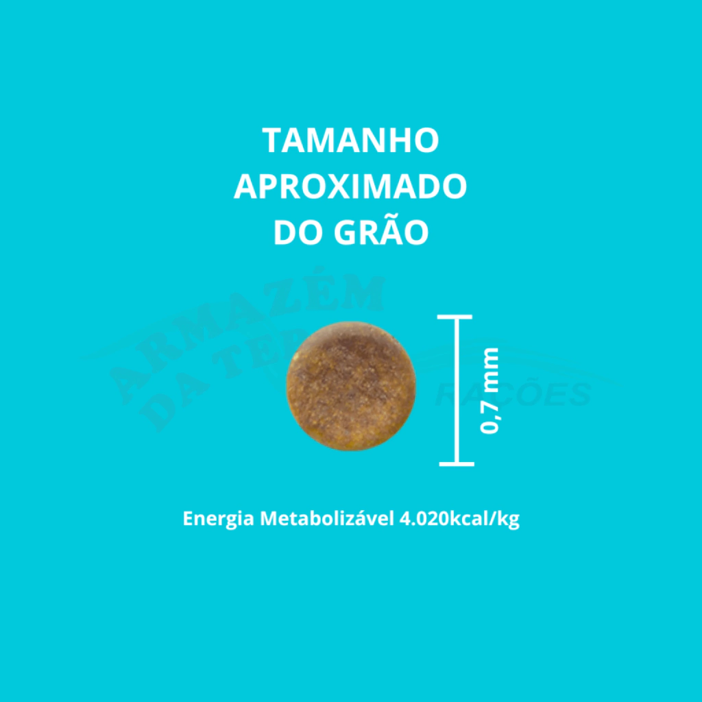 Farinha de vísceras de frango, farinha de torresmo, farinha de peixes, ovo em pó, arroz quebrado, sorgo integral moído, farinha de batata doce, gordura de aves, gordura suína, grão de linhaça, levedura de cervejaria inativada desidratada, polpa desidratada de beterraba (mín. 1%), lignocelulose, cloreto de sódio (sal comum), cloreto de potássio, inulina (FOS) (mín. 0,15%), biomassa de microalgas (Schizochytrium sp. - DHA) (mín. 0,08%), hexametafosfato de sódio (mín. 0,2%), zeólita, extrato de yucca (mín. 0,05%), maçã desidratada (mín. 0,05%), extrato de chá verde (mín. 0,01%), mananoligossacarídeo (MOS) (mín. 0,1%), parede celular de levedura, extrato de alecrim, tocoferol (concentrado), ácido propiônico, hidrolisado de fígado de aves e suíno, acetato de retinol (vit. A), colecalciferol (vit. D3), ácido ascórbico (vit. C), acetato de DL-alfa-tocoferol (vit. E), mononitrato de tiamina (vit. B1), riboflavina (vit. B2), cloridrato de piridoxina (vit. B6), cianocobalamina (vit. B12), bissulfito de menadiona nicotinamida (vit. K3), biotina, cloreto de colina, niacina (ácido nicotínico), ácido fólico, D-pantotenato de cálcio (ácido pantotênico), sulfato de cobre monohidratado, sulfato de ferro, sulfato de zinco, sulfato de manganês, selenito de sódio, iodato de cálcio, proteinato de manganês, proteinato de selênio, proteinato de zinco.