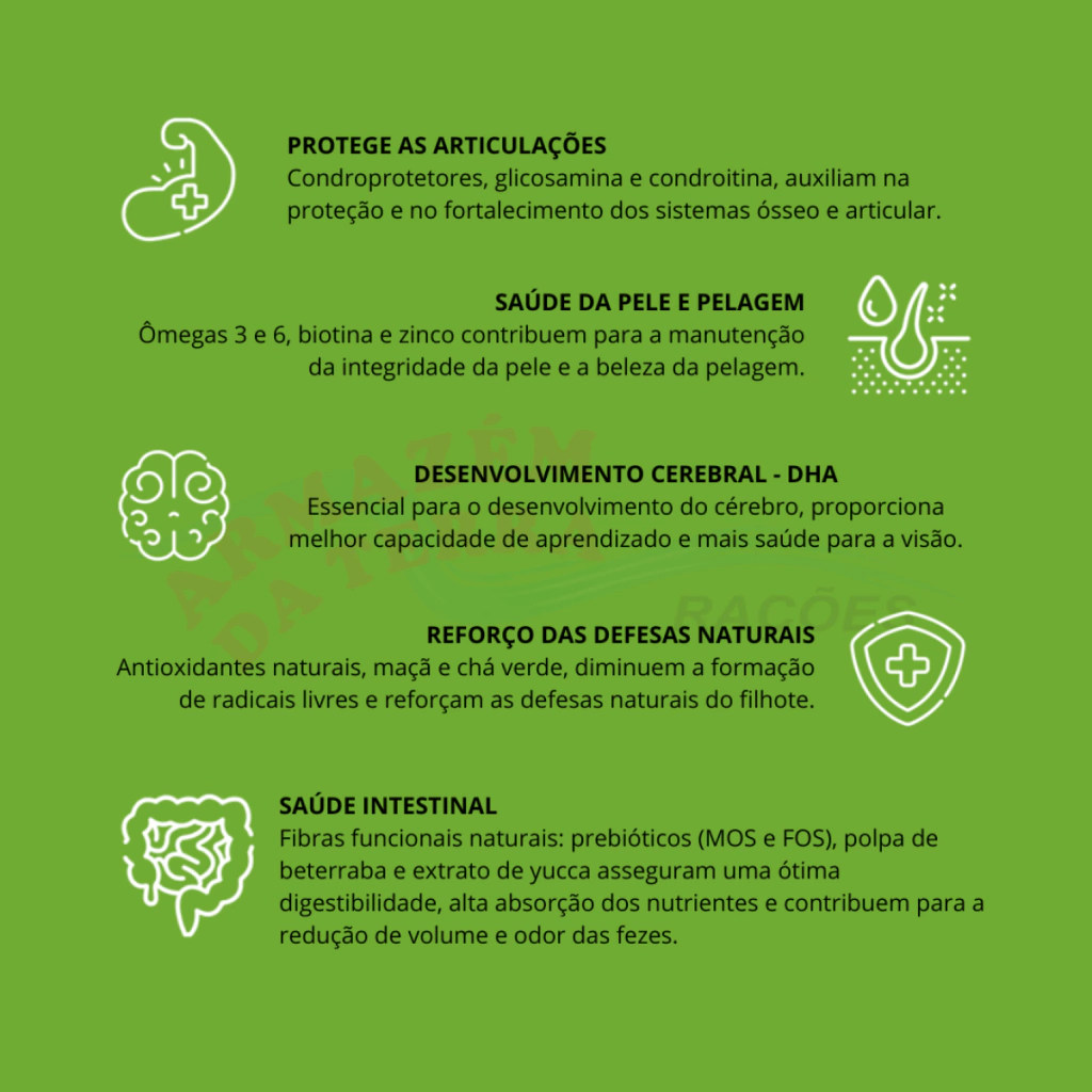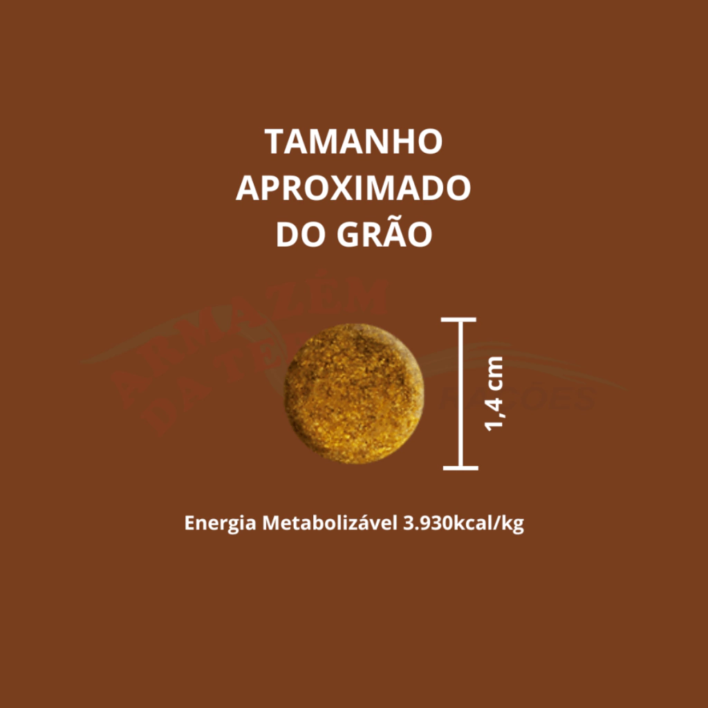Farinha de vísceras de frango, farinha de torresmo, farinha de peixes, ovo em pó, arroz quebrado, sorgo integral moído, farinha de batata doce, gordura de aves, gordura suína, grão de linhaça, levedura de cervejaria inativada desidratada, polpa desidratada de beterraba (mín. 1,5%), lignocelulose, cloreto de sódio (sal comum), cloreto de potássio, inulina (FOS) (mín. 0,15%), biomassa de microalgas (Schizochytrium sp. - DHA) (mín. 0,08%), hexametafosfato de sódio (mín. 0,2%), zeólita, sulfato de glicosamina, sulfato de condroitina, extrato de yucca (mín. 0,05%), maçã desidratada (mín. 0,05%), extrato de chá verde (mín. 0,01%), mananoligossacarídeo (MOS) (mín. 0,2%), parede celular de levedura, extrato de alecrim, tocoferol (concentrado), ácido propiônico, hidrolisado de fígado de aves e suíno, acetato de retinol (vit. A), colecalciferol (vit. D3), ácido ascórbico (vit. C), acetato de DL-alfa-tocoferol (vit. E), mononitrato de tiamina (vit. B1), riboflavina (vit. B2), cloridrato de piridoxina (vit. B6), cianocobalamina (vit. B12), bissulfito de menadiona nicotinamida (vit. K3), biotina, cloreto de colina, niacina (ácido nicotínico), ácido fólico, D-pantotenato de cálcio (ácido pantotênico), sulfato de cobre monohidratado, sulfato de ferro, sulfato de zinco, sulfato de manganês, selenito de sódio, iodato de cálcio, proteinato de manganês, proteinato de selênio, proteinato de zinco.