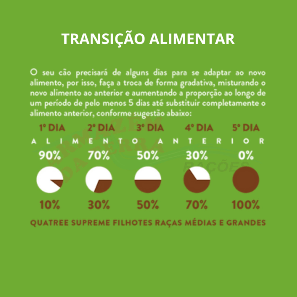 Quatree supreme filhotes raças médias e grandes é um alimento Super Premium formulado com conservantes 100% naturais e livre de transgênicos, garantindo fácil digestão e absorção dos nutrientes. A combinação de proteínas selecionadas e ingredientes naturais e funcionais garante mais saúde e vitalidade para o seu cão. Indicado também para fêmeas a partir da sexta semana de gestação até o desmame total dos filhotes.