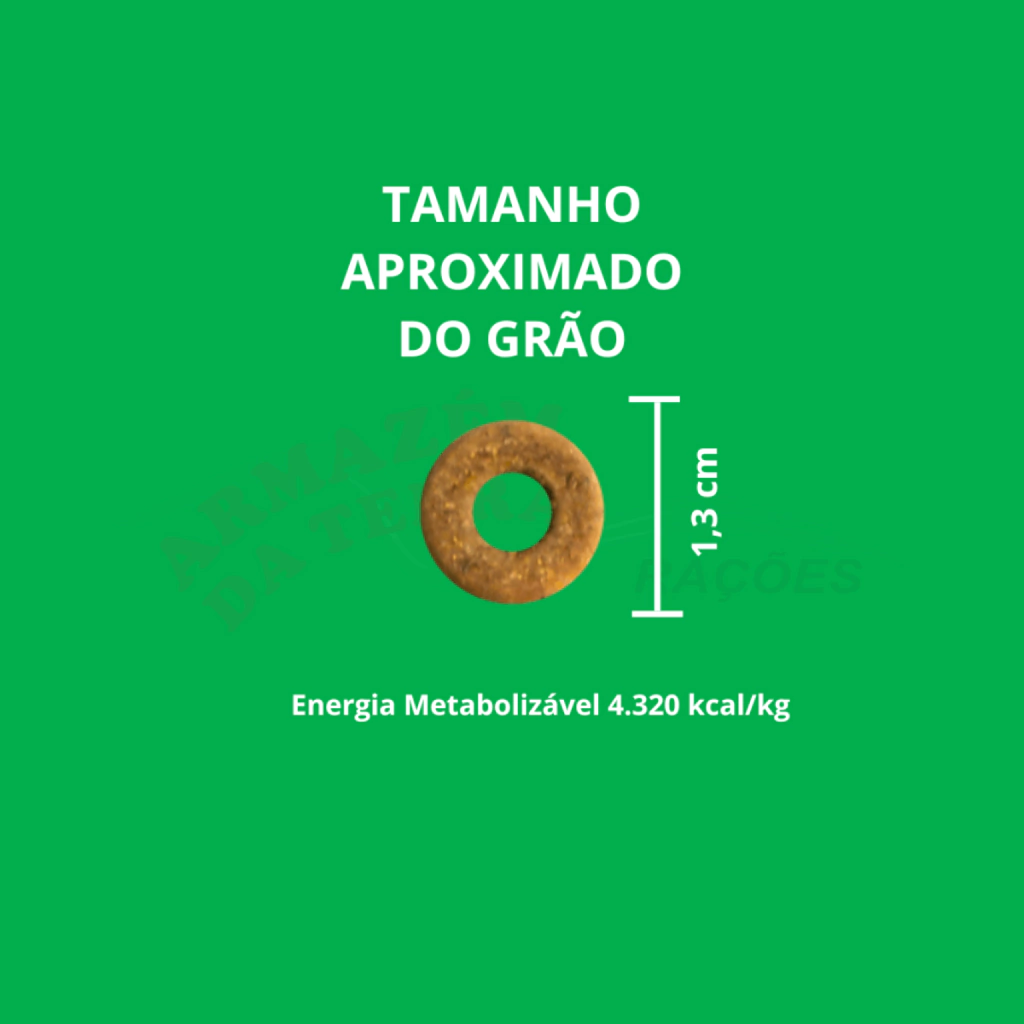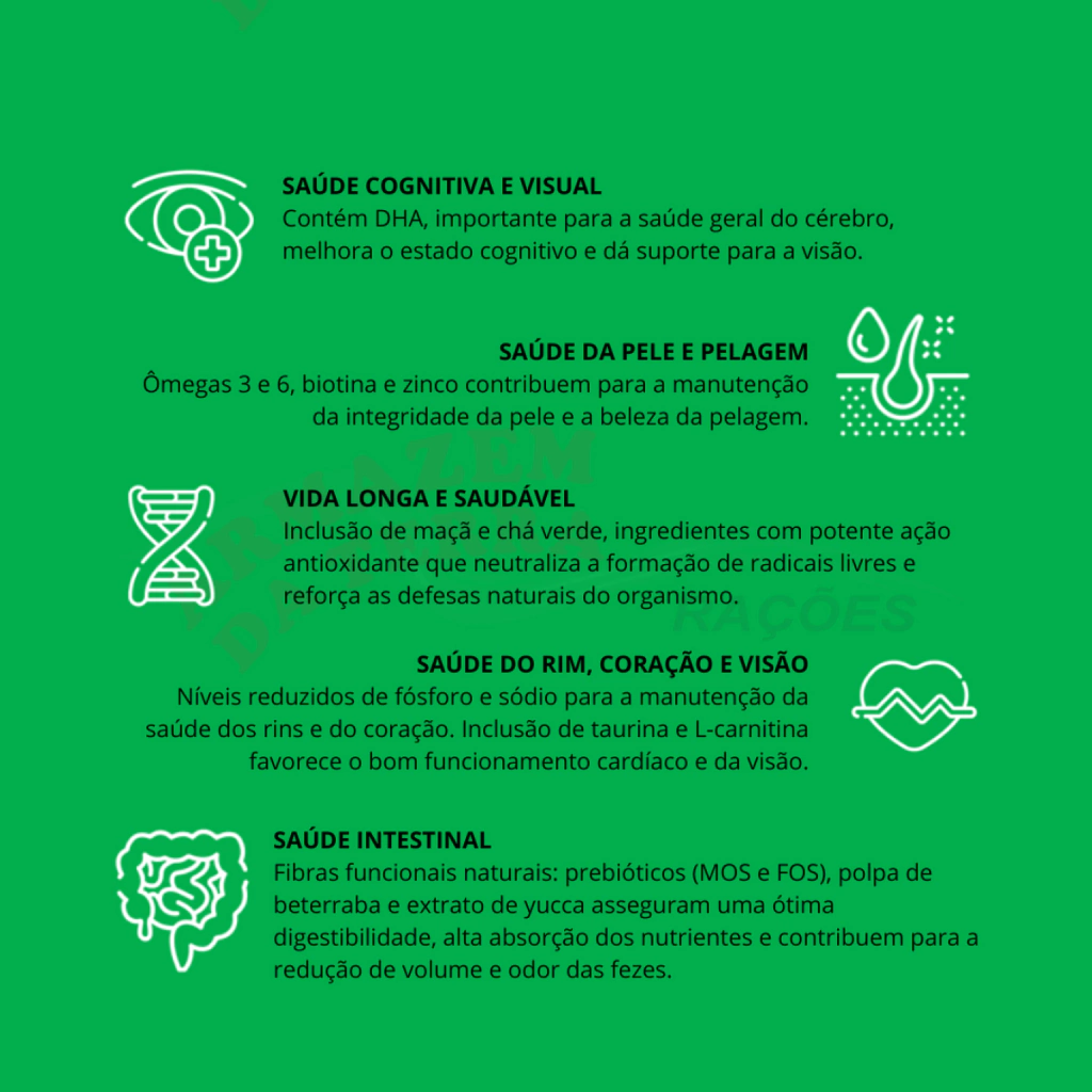 Farinha de vísceras de frango, farinha de torresmo , farinha de carne e ossos de ovino, ovo em pó, arroz quebrado, sorgo integral moído, farinha de batata doce, levedura de cervejaria inativada desidratada, farinha de peixes, polpa desidratada de beterraba (mín. 2,0%), gordura de aves, gordura suína, grão de linhaça, lignocelulose, inulina (FOS) (mín. 0,15%), mananoligossacarídeo (MOS) (mín. 0,1%), cloreto de sódio (sal comum), biomassa de microalgas (Schizochytrium sp. - DHA) (mín. 0,10%), cloreto de potássio, sulfato de glicosamina, sulfato de condroitina, taurina, metionina, hexametafosfato de sódio (mín. 0,3%), zeólita, L-carnitina, extrato de yucca (mín. 0,05%), maçã desidratada (mín. 0,05%), extrato de chá verde (mín. 0,01%), parede celular de levedura, extrato de alecrim, tocoferol (concentrado), ácido propiônico, hidrolisado de fígado de aves e suíno, acetato de retinol (vit. A), colecalciferol (vit. D3), ácido ascórbico (vit. C), acetato de DL-alfa-tocoferol (vit. E), mononitrato de tiamina (vit. B1), riboflavina (vit. B2), cloridrato de piridoxina (vit. B6), cianocobalamina (vit. B12), bissulfito de menadiona nicotinamida (vit. K3), biotina, cloreto de colina, niacina (ácido nicotínico), ácido fólico, D-pantotenato de cálcio (ácido pantotênico), sulfato de cobre monohidratado, sulfato de ferro, sulfato de zinco, sulfato de manganês, selenito de sódio, iodato de cálcio, proteinato de manganês, proteinato de selênio, proteinato de zinco.