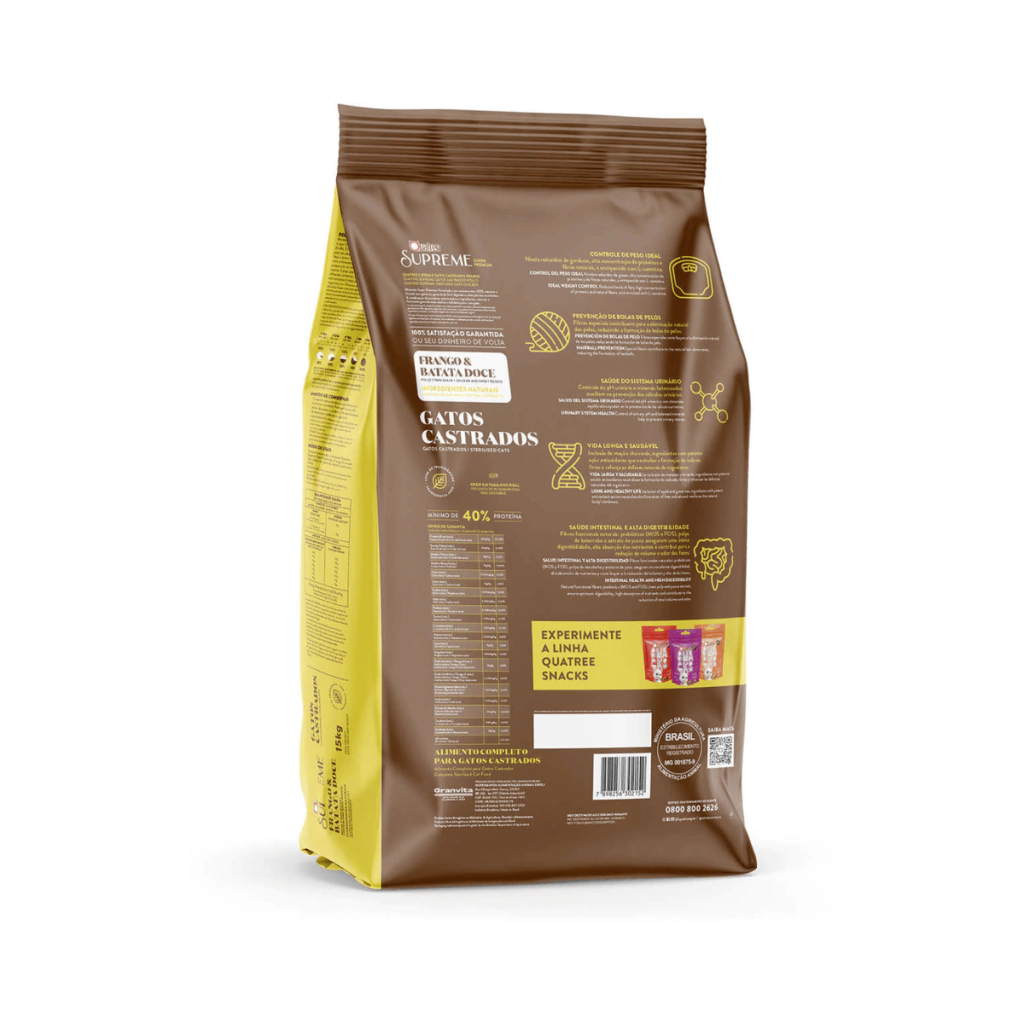 A Ração Seca Quatree Supreme Frango e Batata Doce para Gatos Castrados é um alimento Super Premium formulado especificamente para atender as exigências de gatos castrados. Os ingredientes nobres em sua composição oferecem uma nutrição completa e balanceada, e oferece o equilíbrio de minerais, que contribui com a saúde do trato urinário. Além disso a ração inclui DHA, que auxilia a manutenção da saúde cognitiva e visão. Contém antioxidantes naturais e prebióticos, ingredientes que proporcionam mais vitalidade e longevidade para o seu gato.
