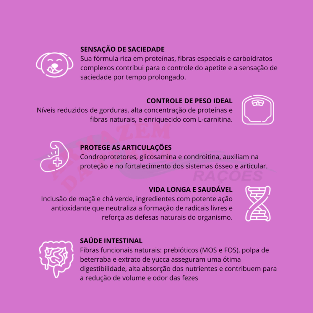 Um alimento Super Premium formulado com conservantes 100% naturais e livre de transgênicos, garantindo fácil digestão e absorção dos nutrientes. A combinação de proteínas selecionadas e ingredientes naturais e funcionais ajuda a diminuir e controlar o peso de cães com tendência a engordar, castrados ou com baixa atividade física.