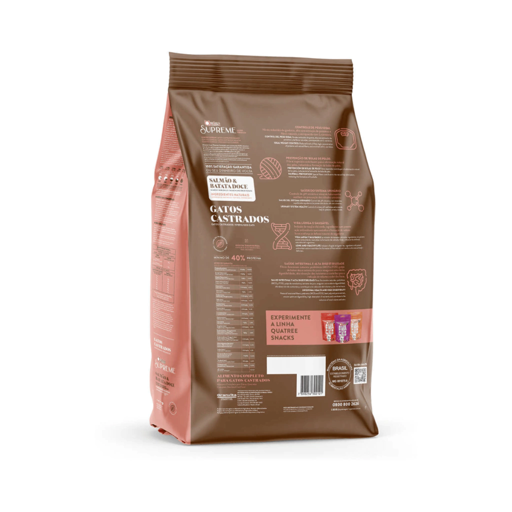 A Ração Seca Quatree Supreme Salmão e Batata Doce para Gatos Castrados é um alimento Super Premium formulado especificamente para atender as exigências de gatos castrados. Os ingredientes nobres em sua composição oferecem uma nutrição completa e balanceada, e oferece o equilíbrio de minerais, que contribui com a saúde do trato urinário. Além disso a ração inclui DHA, que auxilia a manutenção da saúde cognitiva e visão. Contém antioxidantes naturais e prebióticos, ingredientes que proporcionam mais vitalidade e longevidade para o seu gato.
