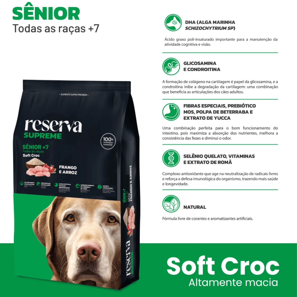 Dê ao seu cão idoso o cuidado que ele merece com a Ração Reserva Supreme Sênior. Este alimento altamente macio é formulado para facilitar a mastigação dos cães mais velhos, proporcionando conforto e um sabor irresistível a cada refeição.
