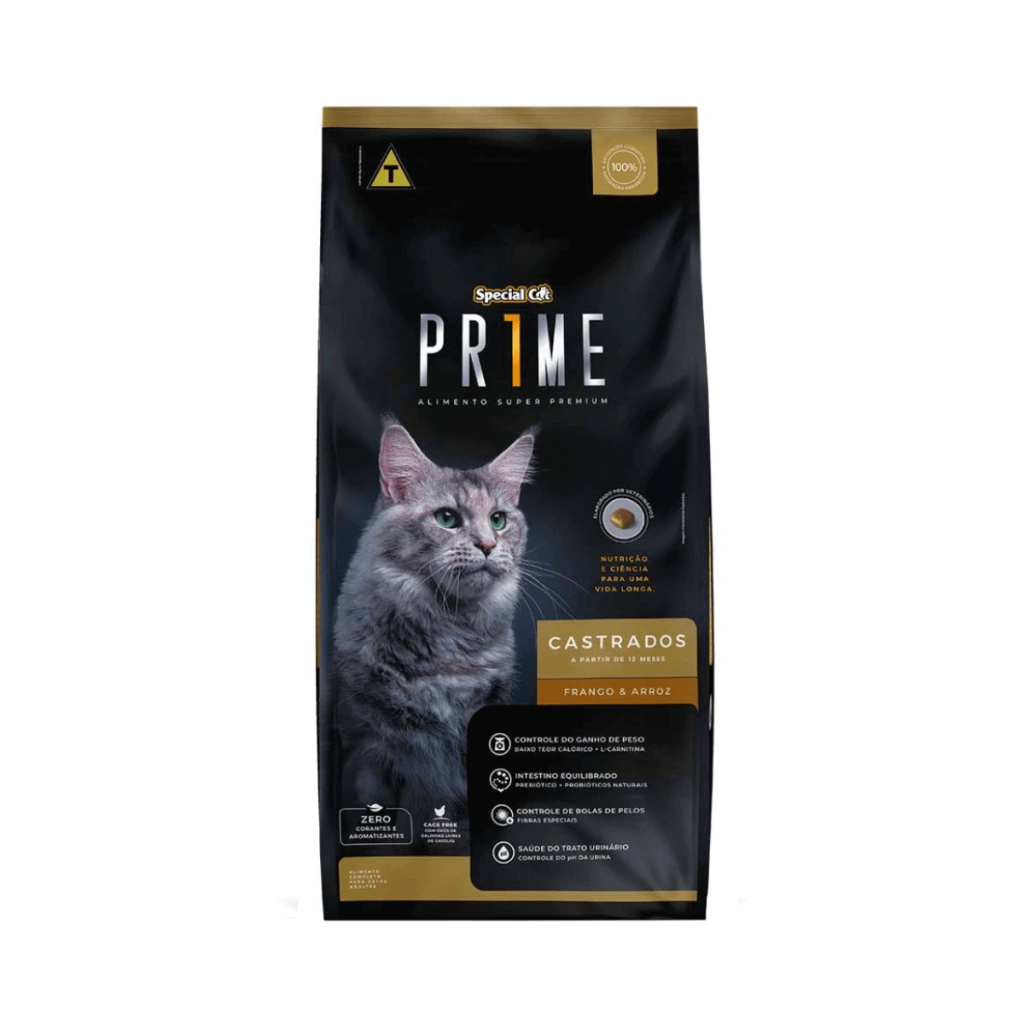 A Ração Special Cat Prime Frango e Arroz para Gatos Adultos Castrados é formulada com ingredientes nobres e possui L-Carnitina para auxiliar no controle do peso ideal. Contém prebiótico e probióticos naturais para saúde intestinal além de auxiliar na saúde do trato urinário, através do controle do pH da urina