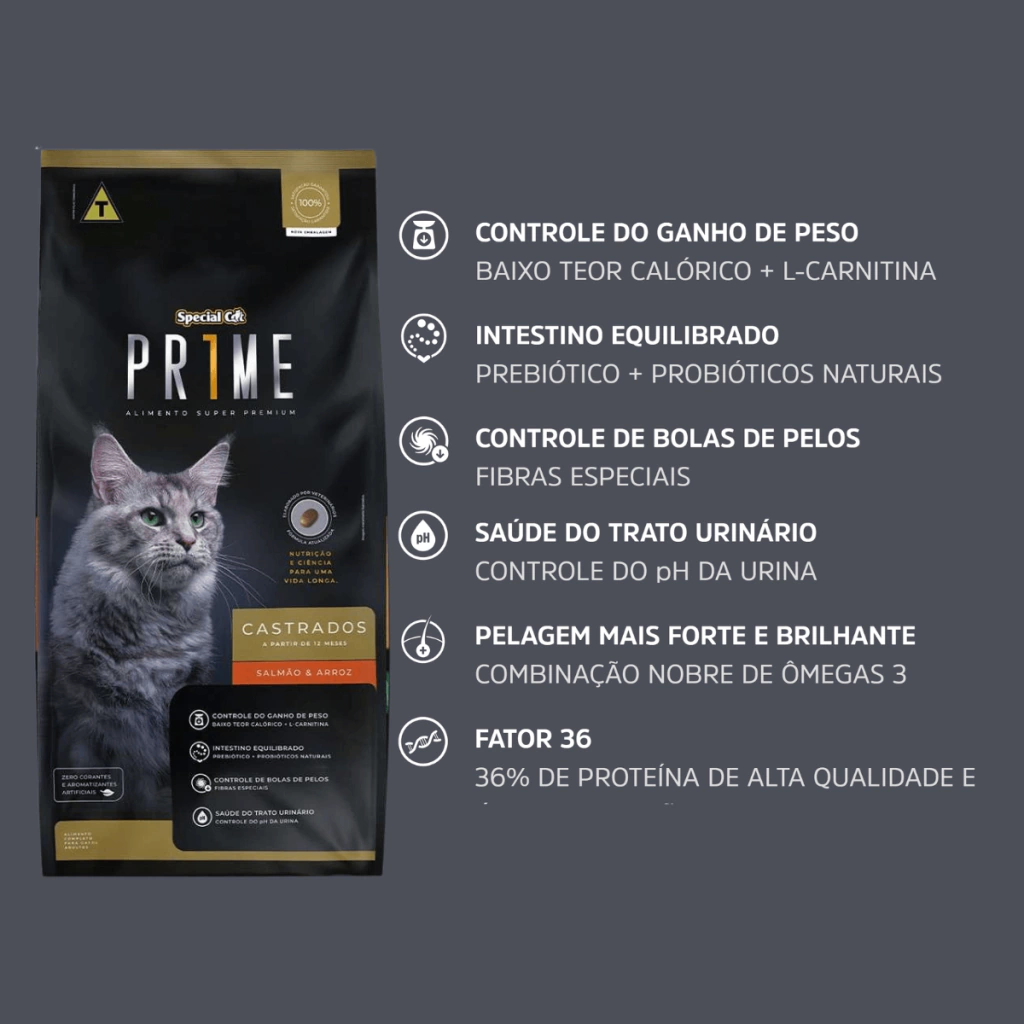 A Ração Special Cat Prime Salmão e Arroz para Gatos Adultos Castrados é formulada com ingredientes nobres e possui L-Carnitina para auxiliar no controle do peso ideal. Contém prebiótico e probióticos naturais para saúde intestinal além de auxiliar na saúde do trato urinário, através do controle do pH da urina.