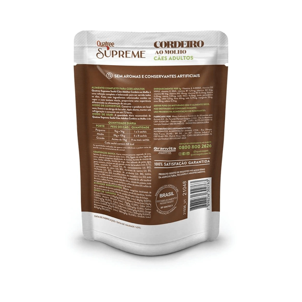 Disponível em embalagens de 100g, a Quatree Supreme Cordeiro é a escolha ideal para quem busca um alimento completo e natural. Além disso, o produto conta com Satisfação Garantida!