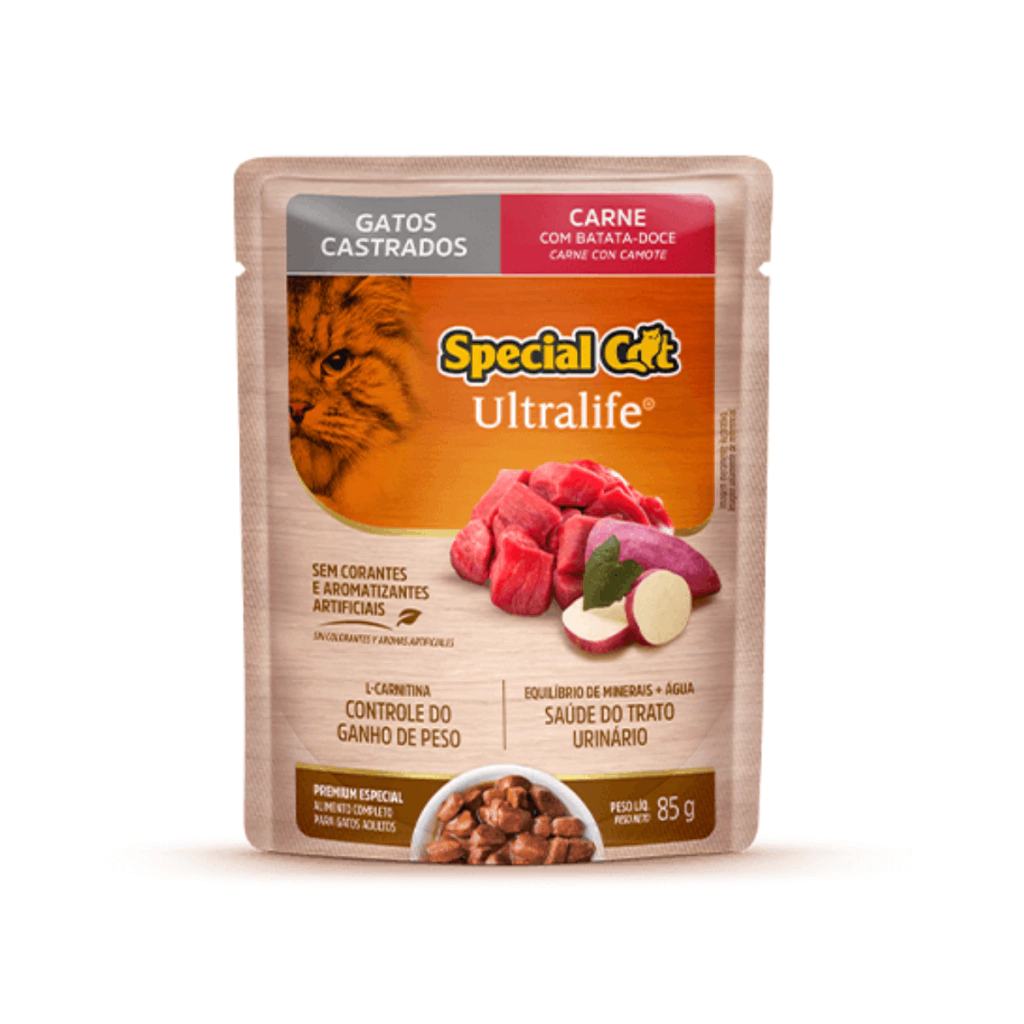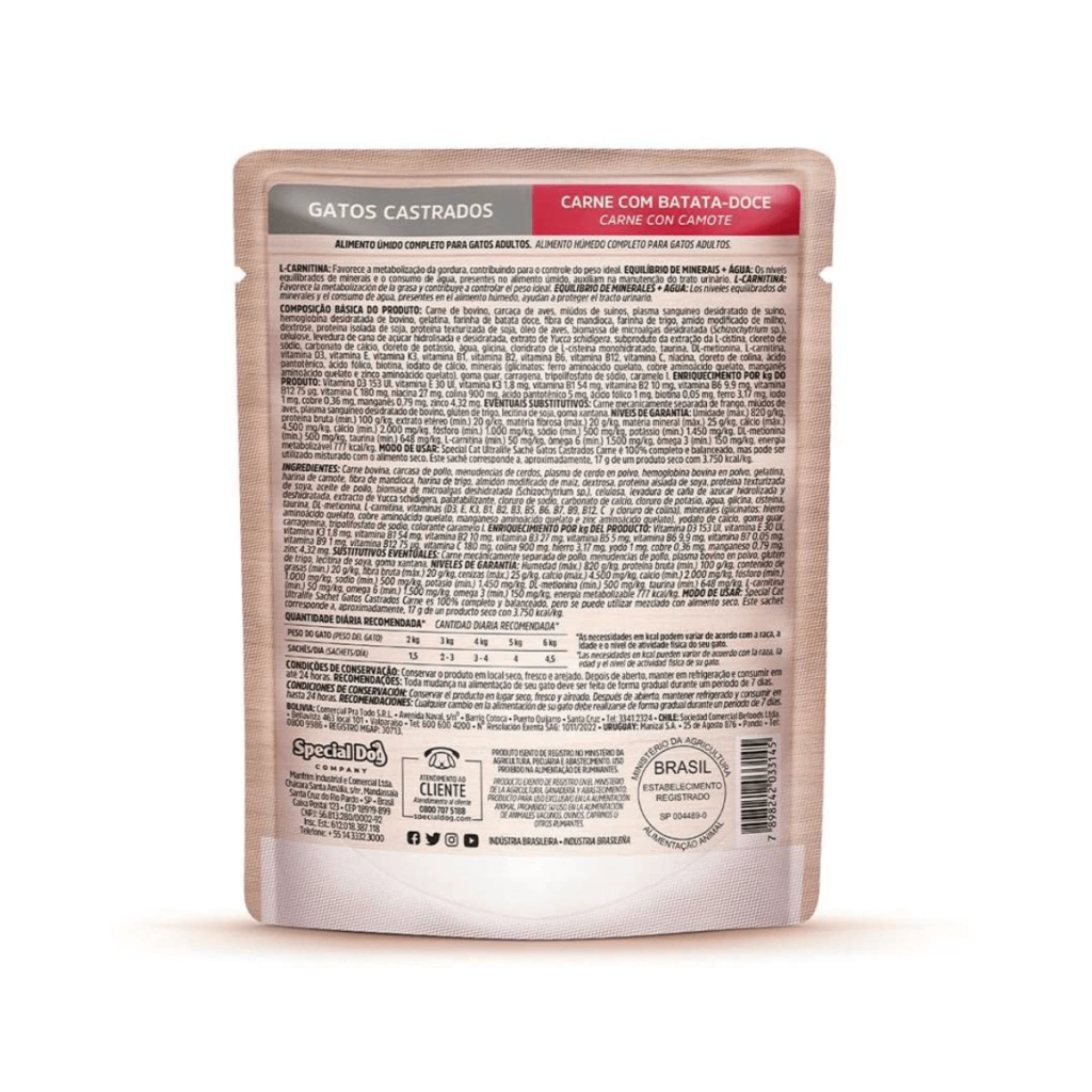 Special Cat Sachê castrados sabor carne é 100% completo e balanceado, mas pode ser utilizado misturado com alimento seco. Cada special cat sachê castrados sabor carne correspond