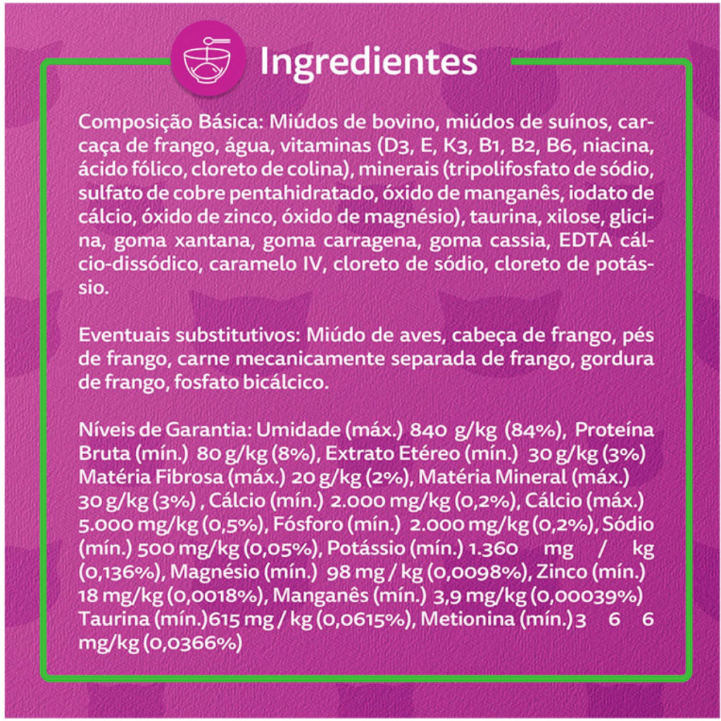 · Miúdo de bovino, miúdos de aves, água, minerais (tripolifosfato de sódio, cloreto de potássio, sulfato de cobre, óxido de manganês, iodato de cálcio, óxido de zinco, selenito de sódio, óxido de magnésio), vitaminas (D3, E, B1, B2, B6, B12, ácido pantotênico, niacina, ácido fólico, cloreto de colina), metionina, taurina, goma carragena, goma cássia, goma xantana, corante caramelo, EDTA cálcio dissódico, palatabilizante. Eventuais substitutivos: miúdos de suínos, goma konjac, gordura de frango, carne de frango mecanicamente separada.