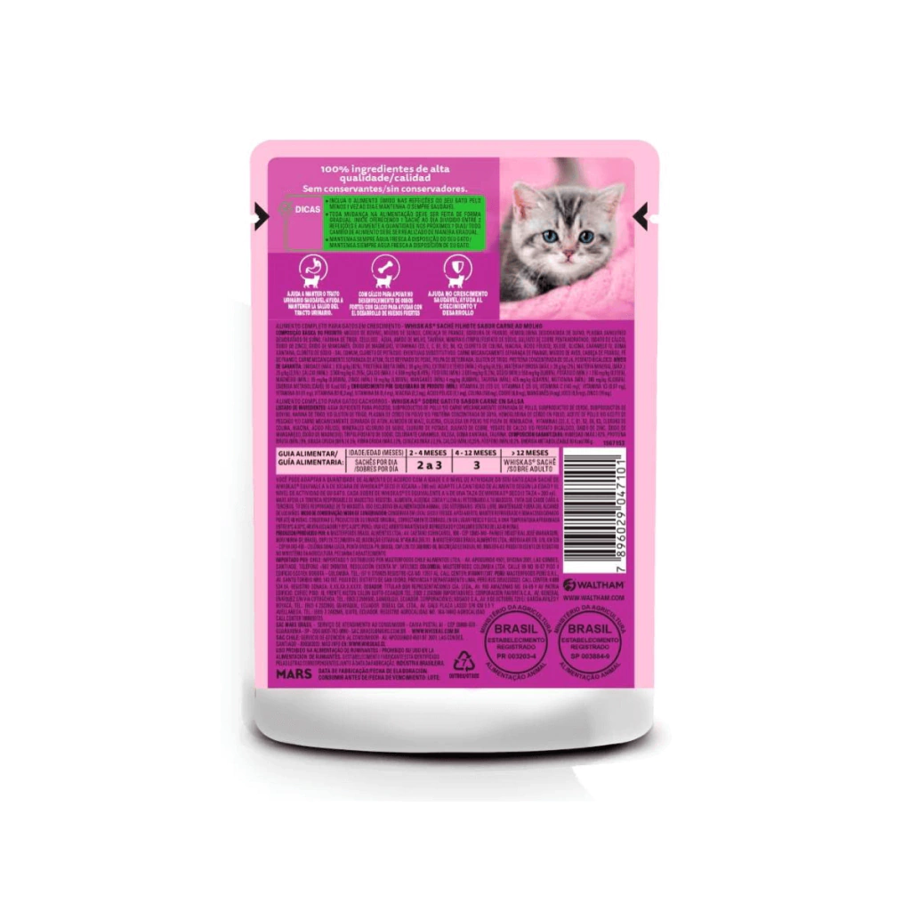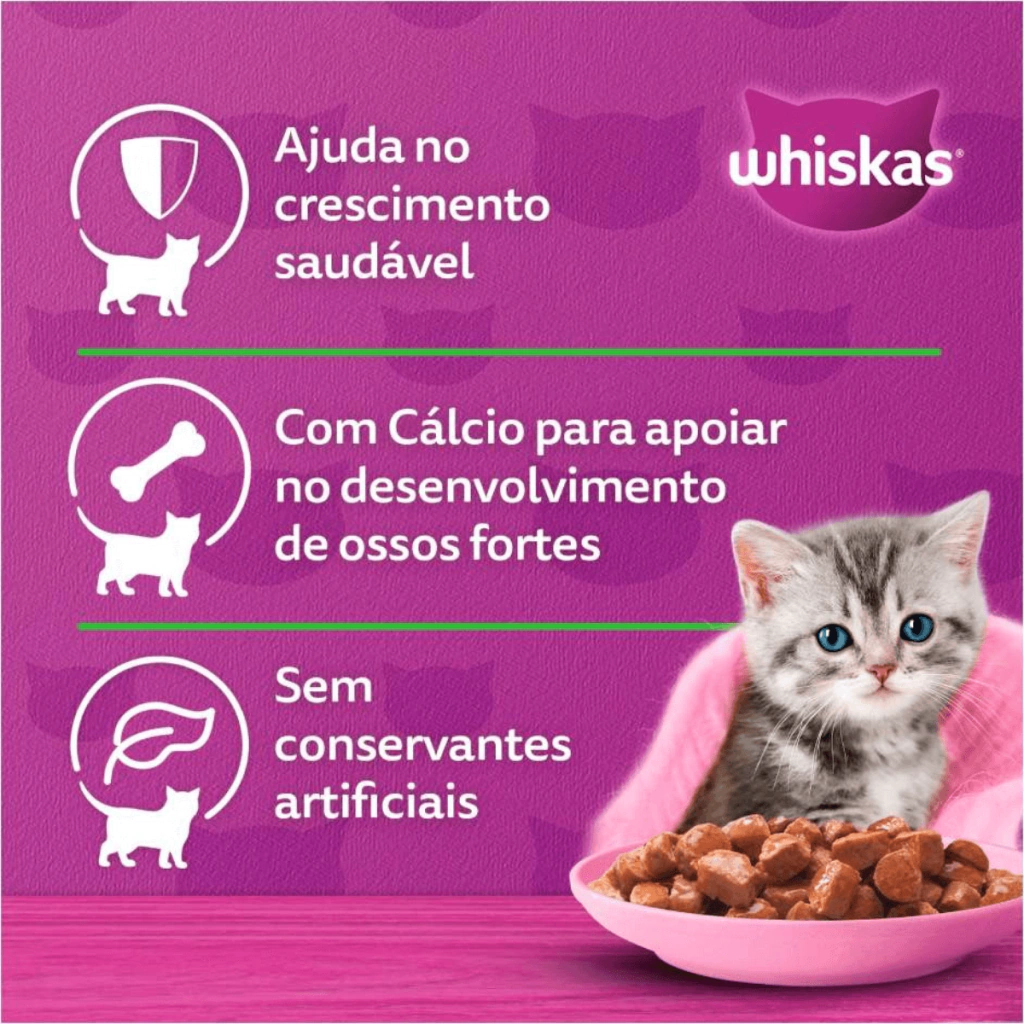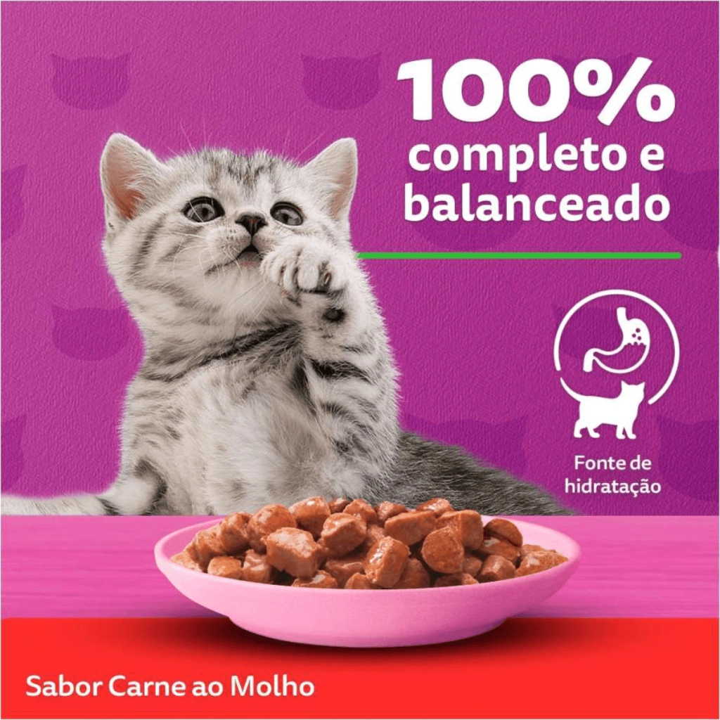 Whiskas Sachê Carne ao Molho para Gatos Filhotes é a refeição completa e balanceada que oferece todos os nutrientes necessários para o crescimento saudável do seu gatinho. Com suculentos pedacinhos de carne cozidos a vapor, essa ração úmida proporciona uma alimentação deliciosa e fácil de mastigar, com alta absorção de nutrientes.