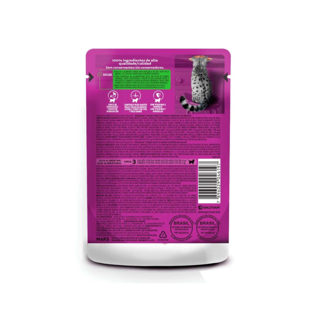 WHISKAS® Sachê Cordeiro ao Molho para Gatos Adultos é uma refeição irresistível e nutritiva que seu gato vai adorar. Com pedaços médios de cordeiro cozidos a vapor, este alimento úmido facilita a mastigação e a digestão, oferecendo uma experiência deliciosa em cada refeição. Sua fórmula é completa e balanceada, com a porção ideal de proteínas, vitaminas e sais minerais para garantir a saúde e o bem-estar do seu felino. Além disso, contribui para a saúde do trato urinário do seu gatinho. Produzido com ingredientes naturais de alta qualidade, é uma escolha sem conservantes, corantes ou aromatizantes artificiais. Ofereça o melhor para o seu gato com WHISKAS®!