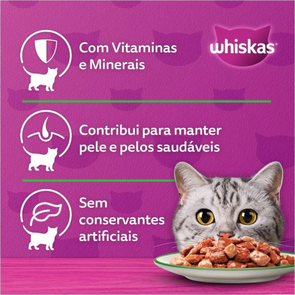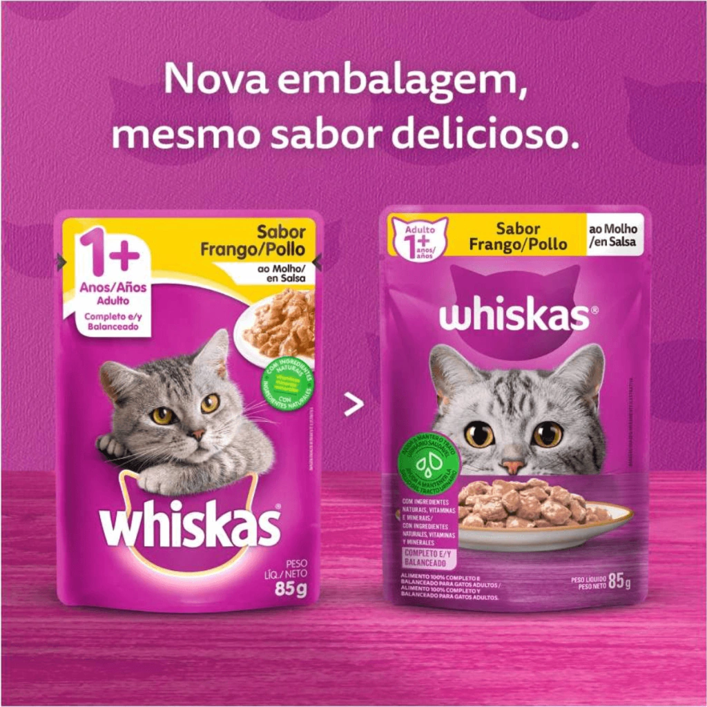 WHISKAS® Sachê Frango ao Molho para Gatos Adultos é a escolha ideal para proporcionar ao seu gato uma refeição saborosa e nutritiva. Com pedaços médios de frango cozidos a vapor, esta ração úmida facilita a mastigação e a digestão, oferecendo uma experiência deliciosa e suculenta. É uma refeição completa e balanceada, que oferece a porção ideal de proteínas, vitaminas e sais minerais essenciais para a saúde do seu felino. Além disso, auxilia na manutenção da saúde do trato urinário do seu gato. Produzido com ingredientes naturais de alta qualidade, é livre de conservantes, corantes e aromatizantes artificiais, garantindo o melhor para o seu gato com WHISKAS®!
