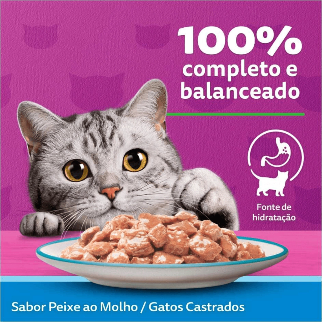 Cuide do seu gato castrado com a deliciosa e nutritiva Ração Úmida Whiskas Sachê Peixe ao Molho!