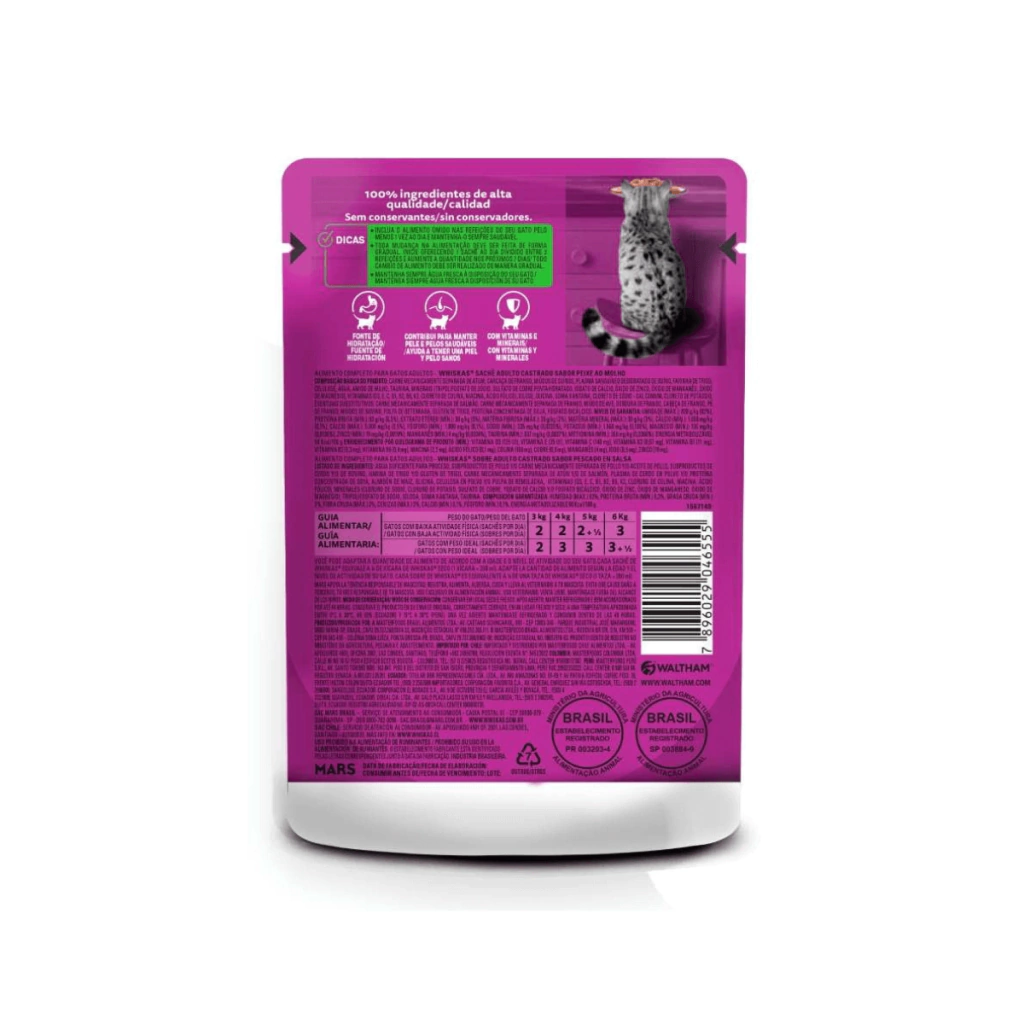 Whiskas Sachê Peixe ao Molho para Gatos Adultos Castrados oferece uma refeição completa e balanceada com suculentos pedacinhos de peixe cozidos a vapor, que garantem uma experiência deliciosa para o seu gato. Especialmente formulado para gatos castrados, ajuda na manutenção do peso ideal e promove a saúde do trato urinário, contribuindo para o bem-estar do seu felino.