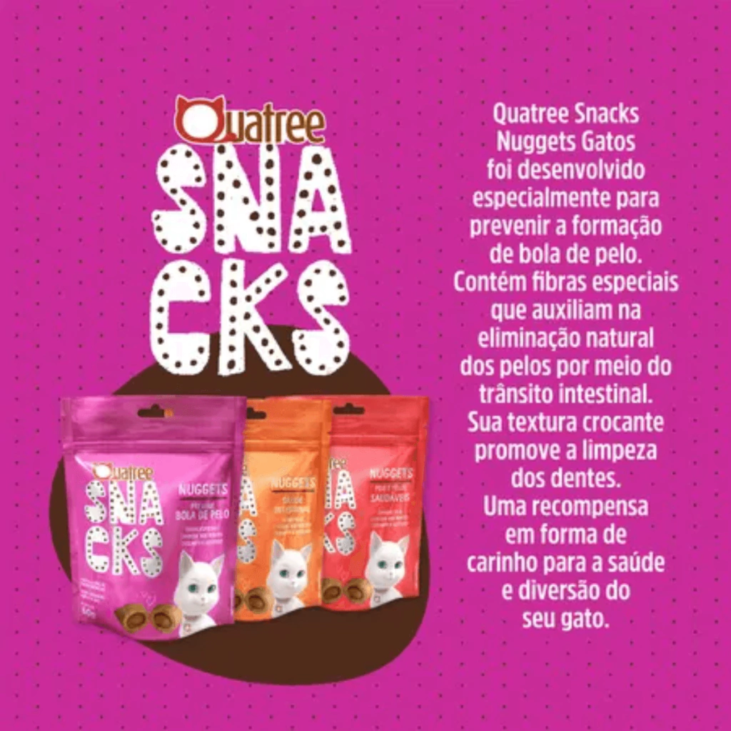 Os Snacks Quatree para Gatos Adultos Sabor Frango Bola de Pelo são a opção ideal para gatos adultos que buscam um petisco delicioso e saudável. Com uma fórmula 100% livre de transgênicos e corantes artificiais, esses snacks crocantes e saborosos promovem a saúde oral, ajudando na limpeza dos dentes do seu felino. Enriquecidos com fibras especiais, eles também previnem a formação de bolas de pelo, tornando cada momento de petisco um ato de cuidado. Ofereça ao seu gato o irresistível sabor do frango e o carinho que ele merece!