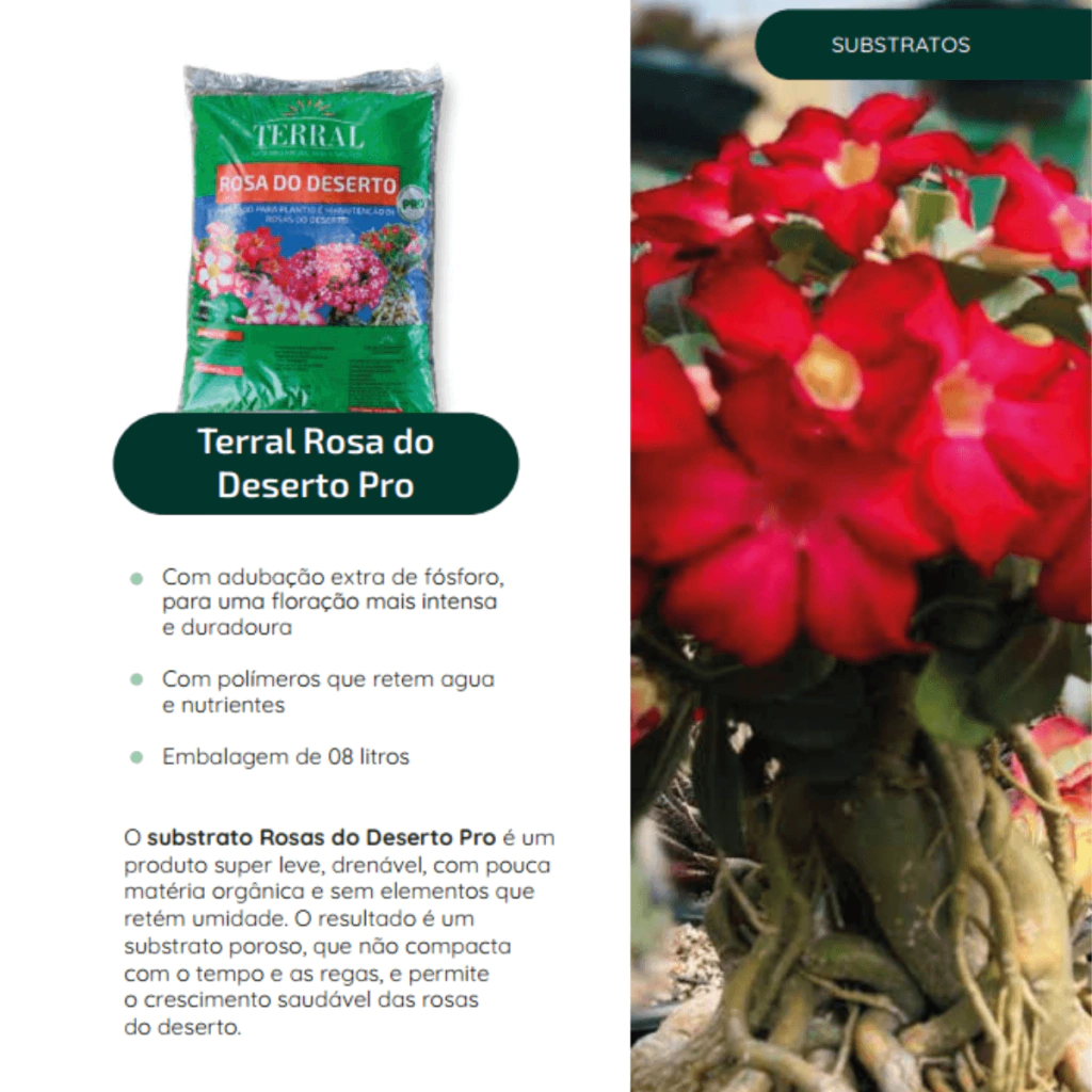 O Substrato Rosa do Deserto PRO da linha Terral é especialmente formulado para o plantio e manutenção de rosas do deserto, proporcionando as condições ideais para um crescimento vigoroso e saudável.