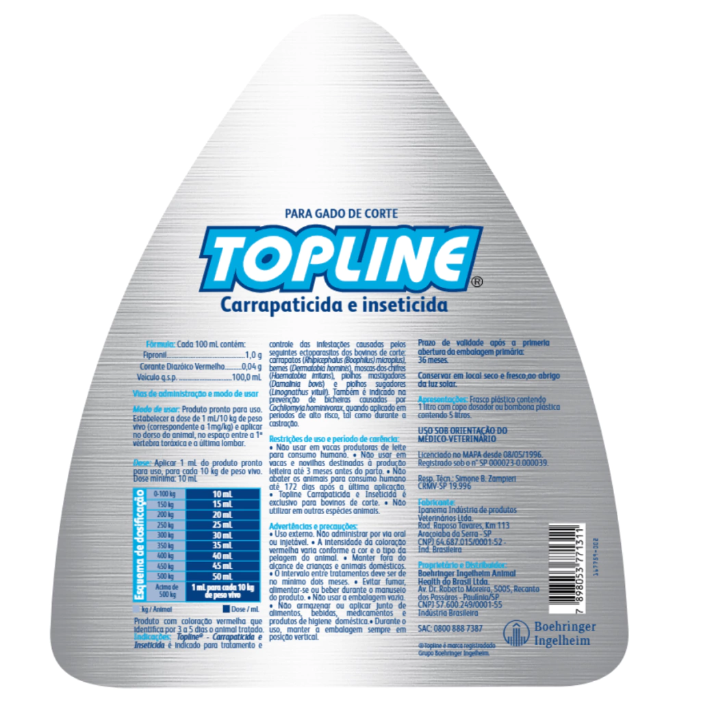 Topline — Carrapaticida e Inseticida é indicado para tratamento e controle das infestações causadas pelos seguintes ectoparasitos dos bovinos de corte: carrapatos (Riphicephalus B. microplus), bernes (Dermatobia hominis), moscas-dos-chifres (Haematobia irritans), piolhos mastigadores (Damalinia bovis) e piolhos sugadores (Linognathus vituli). Também é indicado na prevenção de bicheiras causadas por Cochliomyia hominivorax, quando aplicado em períodos de alto risco, tal como durante a castração. Produto com coloração vermelha que identifica por 3 a 5 dias o animal tratado.