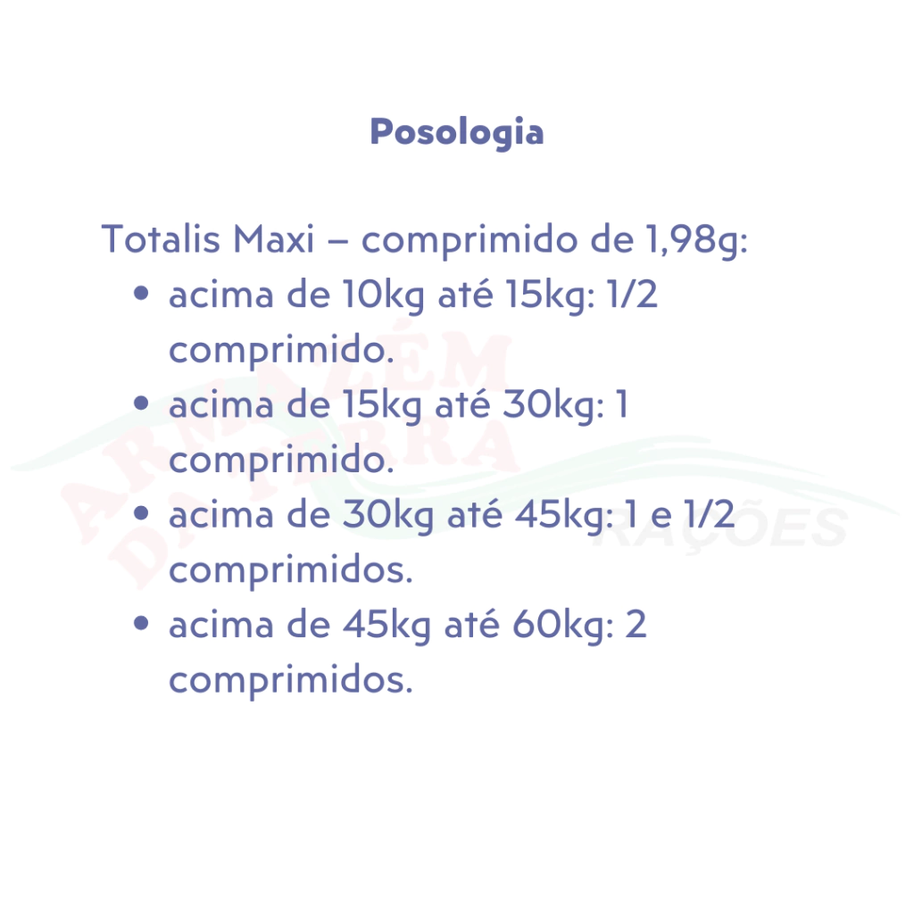 Totalis Maxi (1,98g) - administrar 1 comprimido a cada 30 kg de peso.