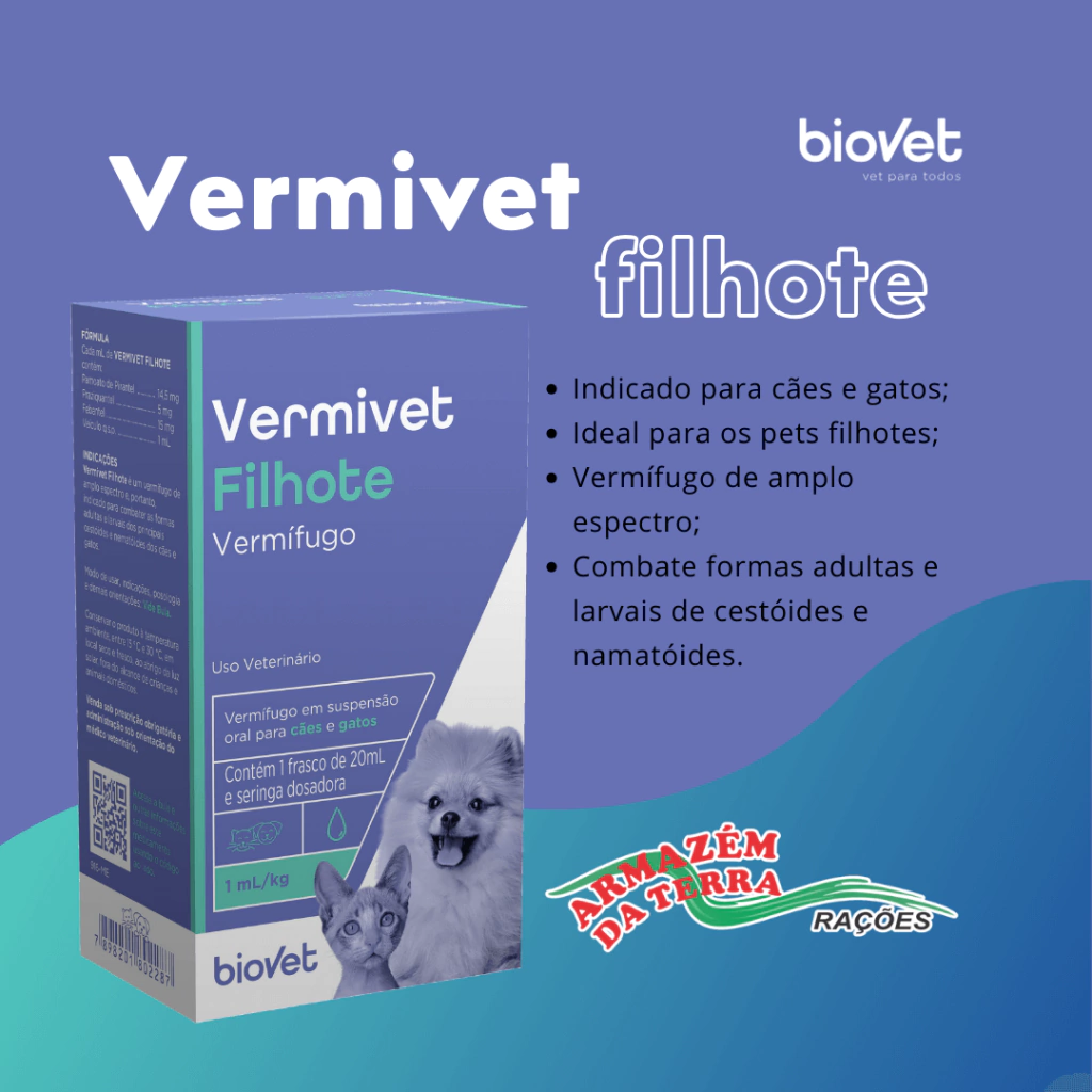 Vermivet Filhote é um vermífugo de amplo espectro e portanto indicado para combater as formas adultas e larvais dos principais cestóides e nematóides dos cães e gatos.